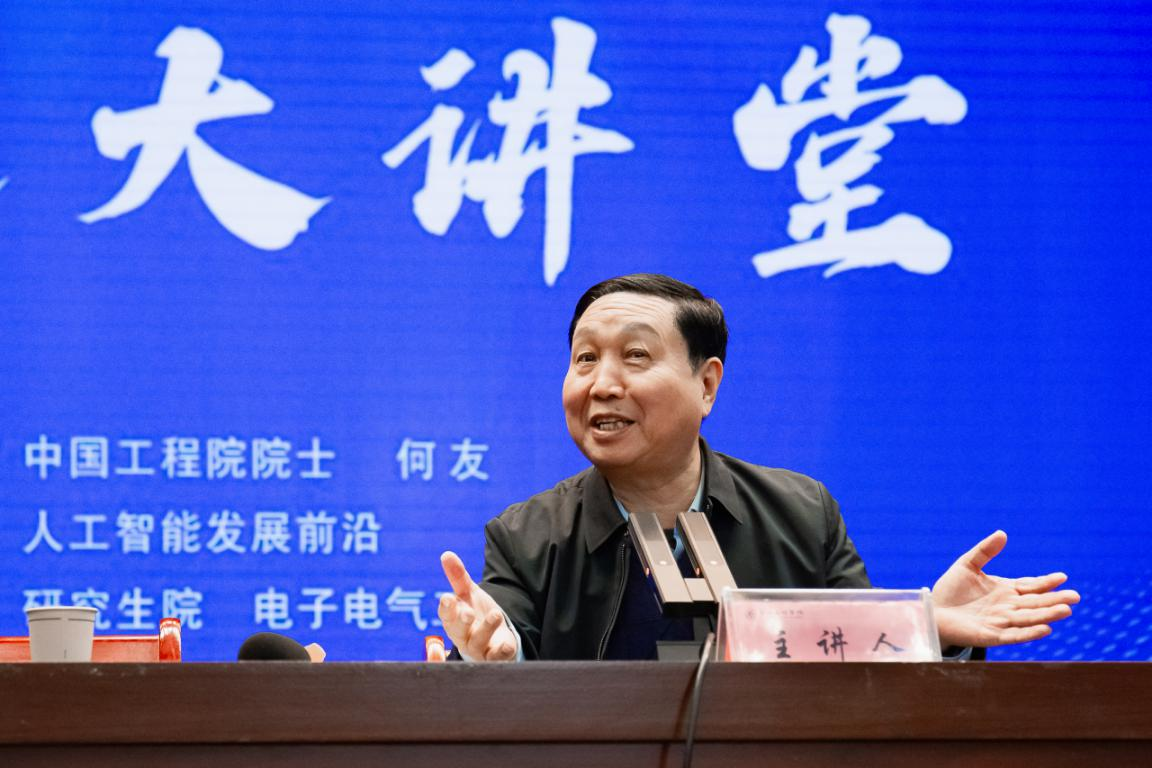 授课中,何友院士以“横渠大讲堂”为载体,围绕人工智能领域,从“发展简介、理论前沿、技术前沿、产业前沿和投资动态”五个维度,系统梳理了人工智能技术的发展脉络,深入剖析了当前领域的最新研究成果、核心技术突破及未来应用方向,用通俗易懂的语言解读了人工智能与工程科技、产业发展的深度融合路径,为在场师生带来了一场兼具学术深度与实践指导意义的知识盛宴。