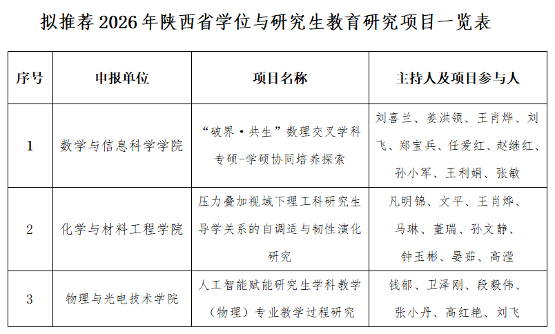 根据陕西省学位与研究生教育研究中心《关于申报2026年陕西省学位与研究生教育研究项目的通知》文件精神,经个人申报、学院推荐、校教学工作指导委员会2026年3月11日评审,学校拟推荐3项项目参与2026年陕西省学位与研究生教育研究项目申报,拟推荐项目信息如下。